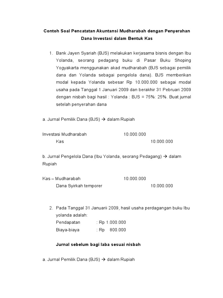 Pictures. Mudharabah adalah salah satu akad di bank syariah yang juga dikenal dengan bagi hasil. Klik di sini untuk informasi file lengkap contoh jurnal mudharabah selengkapnya.
